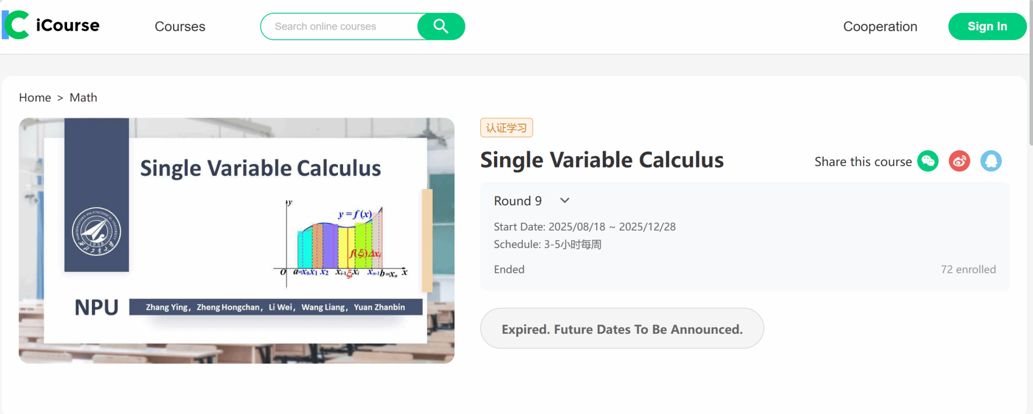 2.Single Variable Calculus(单变量微积分)国际爱课程平台课程链接,可进入课程介绍页,参加学习:https://www.icourse163.org/en/mooc/course/NPU1-145825216