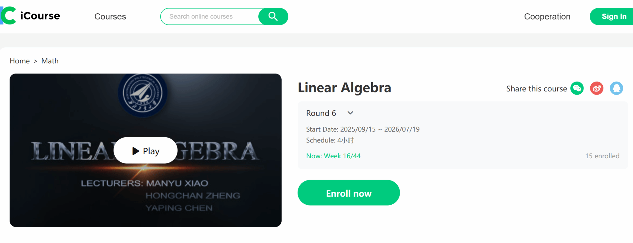 1.Linear Algebra(线性代数)国际爱课程平台课程链接,可进入课程介绍页,参加学习:https://www.icourse163.org/en/mooc/course/NPU1-1458030173