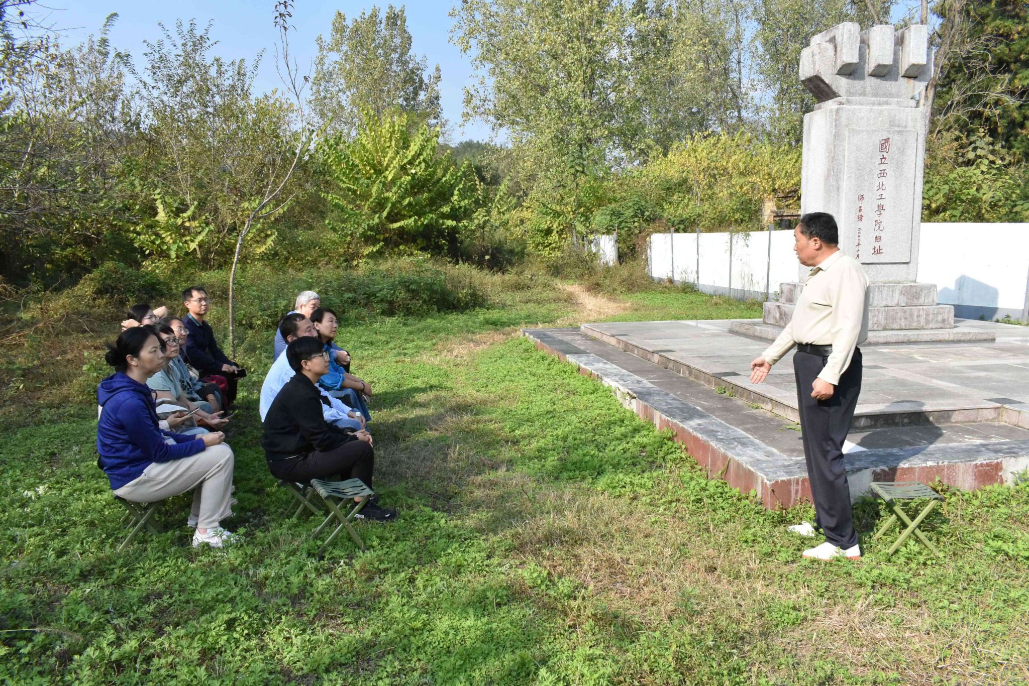 在国立西北工公司旧址纪念碑前,学员们认真聆听了城固县博物馆原馆长苟保平老师的现场授课,一起重温了西北联大艰苦的创始岁月和发展历程。苟馆长细致生动地讲述了抗日战争时期,诞生于民族危亡之际的国立西北联合大学经历了“自合至分”和“辗转迁徙”的发展轨迹,国立西北工公司的学子们不畏艰难、刻苦求学的感人事迹。正是凭借着这样的精神与情怀,古路坝先后走出了一千多位毕业生,其中有“中国航天材料之父”师昌绪、清华大学原董事长高景德等十余位两院院士。古路坝为我国的抗战胜利和经济社会发展提供了有力的人才支持,“古路坝灯火”激励着西工大人追忆先辈们教育救国的理念与情怀。