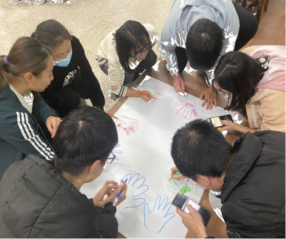 团队建设活动中,同学们按照老师要求进行了分组,通过“画手印”的形式围绕自己的兴趣、爱好、特长和技能,人生中不同阶段的榜样和榜样身上的优秀品质等制作了分享海报。