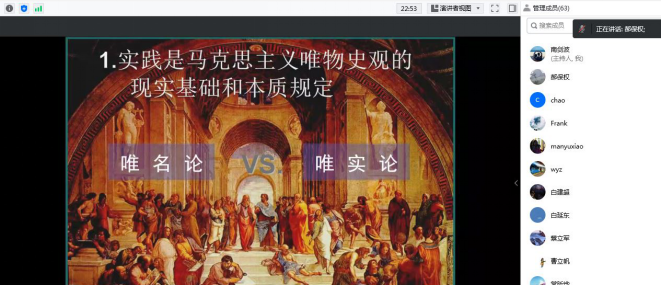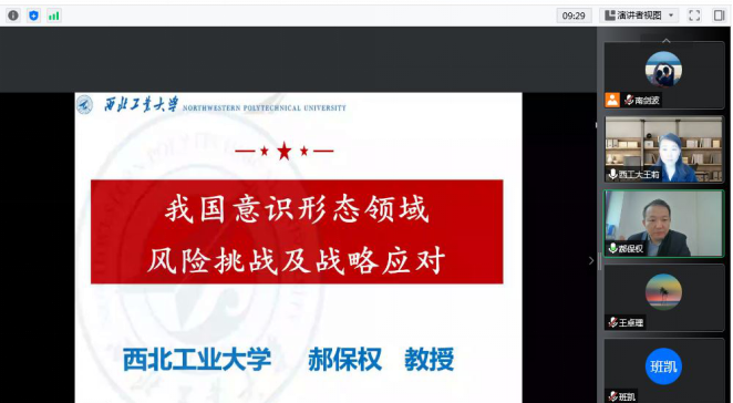 为进一步加强公司师德师风建设,提高意识形态阵地建设和管理能力,强化教职工意识形态防范意识,压紧压实意识形态工作,团结凝聚广大教师以更加昂扬向上的精神风貌和立德树人的扎实行动迎接党的二十大胜利召开,按照公司《关于开展w66利来旗舰厅2022年“师德师风建设月”活动的通知》要求,9月29日通过线上会议,w66利来旗舰厅邀请陕西省政党治理与意识形态安全中心主任、公司马克思主义公司教授郝保权老师做题为《我国意识形态领域的风险挑战及战略应对》的专题报告,公司全体教职工参加了此次报告会,报告会由党委书记王莉主持。