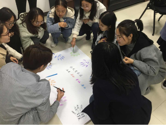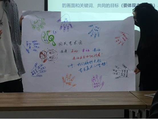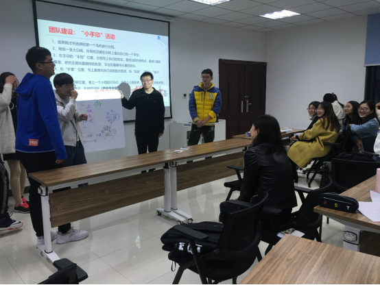 接下来的团队建设让活动进入高潮,同学们按自己的意愿分为五组,每组同学在规定时间内在白纸上写下自己的名字、性格特点、就业意向、团队LOGO、团队口号等,并且进行团队展示。这不仅增强了同学们相互之间的了解,也促进了交流协作能力。