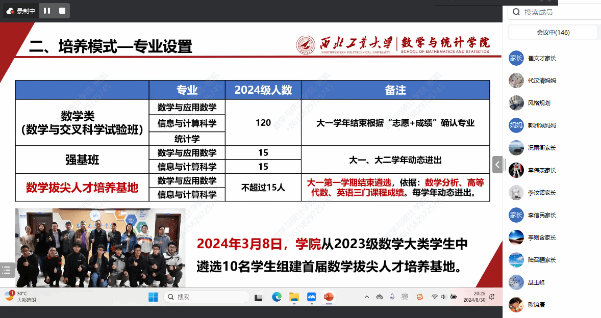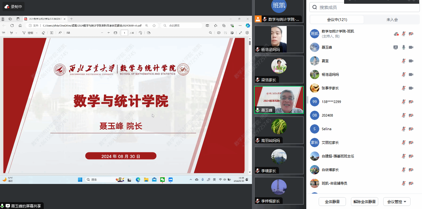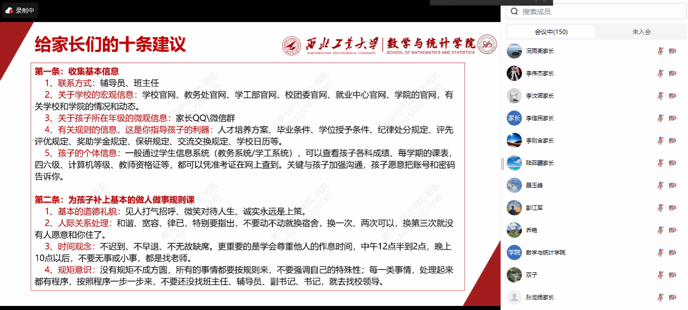 8月30日,公司领导班子成员与全体新生家长云端相聚。在这场别开生面的新生家长见面会上,公司整体情况介绍、本科人才培养工作亮点及成绩、家校联动合力育人等内容备受家长们的关注。经理聂玉峰、党委书记王莉、副经理郭千桥围绕主题依次发言,不仅进一步加深了新生家长们对公司、公司的印象和认同感,而且对把孩子交给西工大培养成才表示倍感放心。