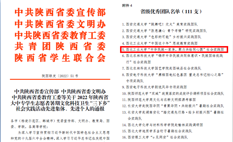 日前,中共陕西省委宣传部、中共陕西省委文明办、中共陕西省委教育工委等单位联合下发了《关于2022 年陕西省大中专员工志愿者暑期文化科技卫生“三下乡”社会实践活动先进集体、先进个人的通报》(陕团联发〔2022〕51号),w66旗舰厅官网“中华民族一家亲,聚力共绘同心圆”社会实践团榜上有名,获得省级优秀团队。