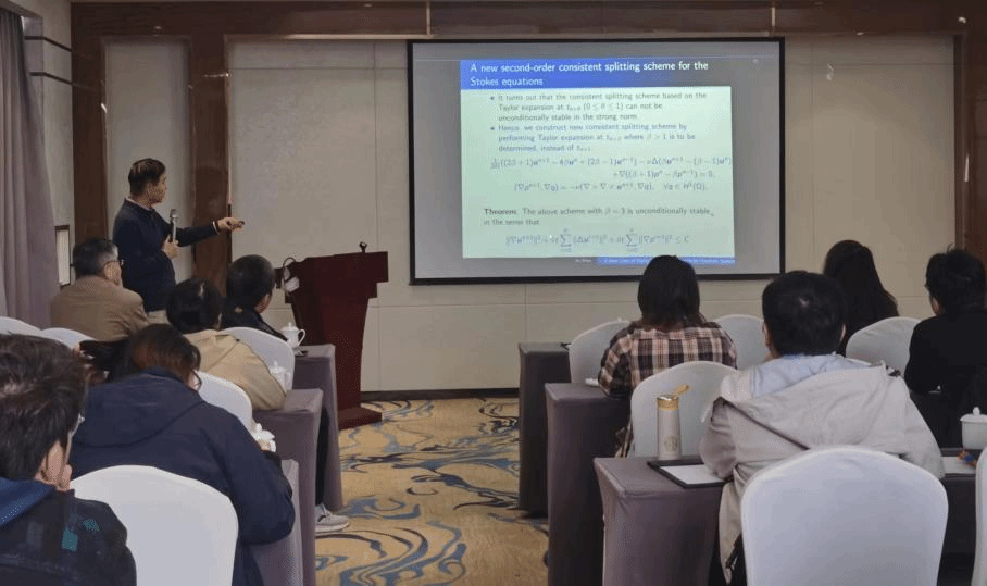 首先,王晓东对于沈捷教授进行了简要介绍,接着,沈捷介绍了传统时间离散格式在处理强刚性问题时的局限性。为解决这种局限性,构造了一种新的针对耗散系统的高刚性稳定时间离散格式,并介绍了该格式在Navier-Stokes方程中的应用。沈捷的报告引人入胜、思路清晰,赢得了现场听众的高度评价和认可。参会的青年教师和员工们也积极提问交流,现场气氛十分活跃。