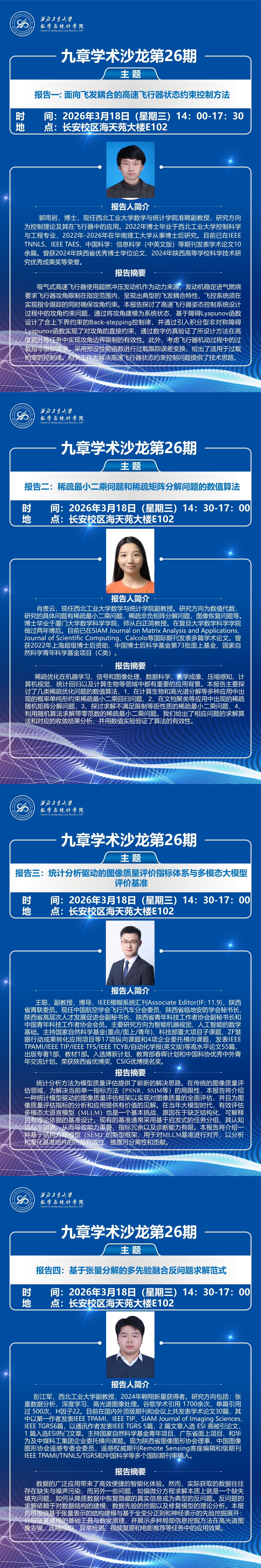 2026年3月18日,由w66利来旗舰厅主办的“九章学术沙龙第26期”在长安校区海天苑大楼E102会议室顺利举行。本次学术沙龙邀请了近两年新加入公司数智科学系的四位青年教师——郭雨岩副教授、肖贵云副教授、王聪副教授、彭江军副教授作专题学术报告。公司经理聂玉峰教授、副经理都琳教授、数智科学系系主任潘璐璐教授以及王俊刚教授等10余人出席活动。与会人围绕报告内容展开深入交流,公司领导对青年教师未来科研发展提出了建设性建议。