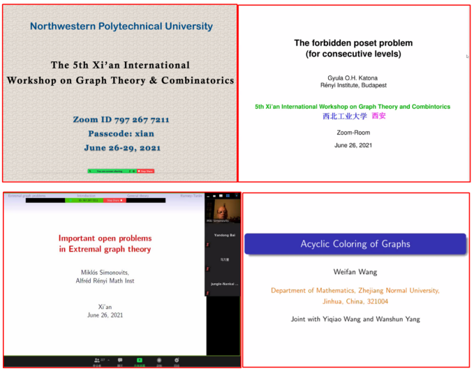 The 5th Xi'an International Workshop on Graph Theory and Combinatorics was held online from June 25th to 29th, 2021. The workshop was hosted by Northwestern Polytechnical University, organized by the School of Mathematics and Statistics. The academician Katona, Academician Simonovits of the Hungarian Academy of Sciences and Academician Gutin of the European Academy of Sciences, Professor Weifan Wang,the Chairman of the Graph Theory Combination Branch of China Operations Research Society, and other 36 international well-known experts made online reports. A total of more than 230 experts and scholars from more than 10 countries such as China, Hungary, Netherlands, France, the United Kingdom, Germany, Belgium, Serbia, Australia, Japan and South Korea participated online.