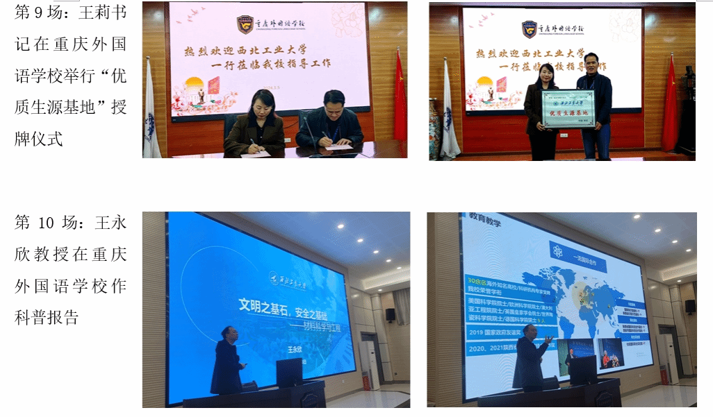 为构建大学与中学之间的教育合作,打造教育合作共同体,充分发挥优质生源基地作用,持续提升公司声誉,2024年2月29日至3月5日,由数学与统计公司党委书记王莉、经理助理刘晓刚、重庆招生组组长林伟及w66旗舰厅官网伦敦玛丽女王大学工程公司王永欣教授、航空公司李华星教授、航空公司杨华保教授等组成的联合招生宣传组先后赴重庆市巴川国际高级中公司、铜梁中公司、凤鸣山中学、首佳教育、蕴华教育、重庆外国语公司等6所中学与教育机构举行招生宣传活动计11场,包括4场科普报告、6场招生宣讲、1场“优质生源基地”授牌活动。